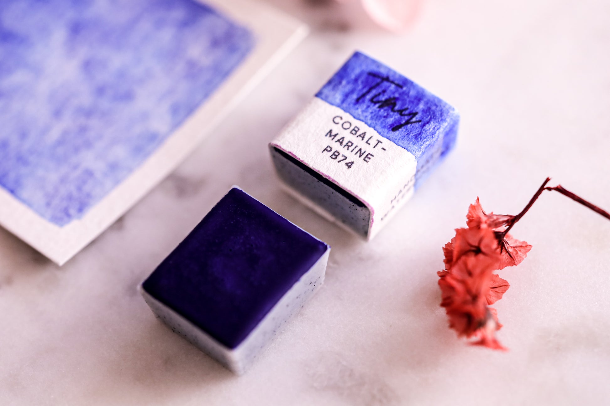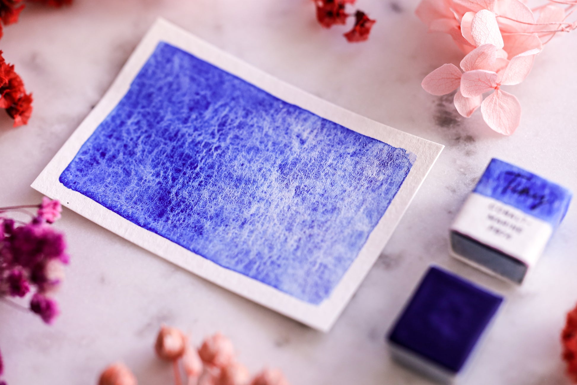 Your order is carefully packed, watercolor pans are are wrapped in a label made of hand-painted Arches paper, with pigment properties detailed on the sides. The label includes an anti-stick section to prevent the paint from adhering to it or the packaging.