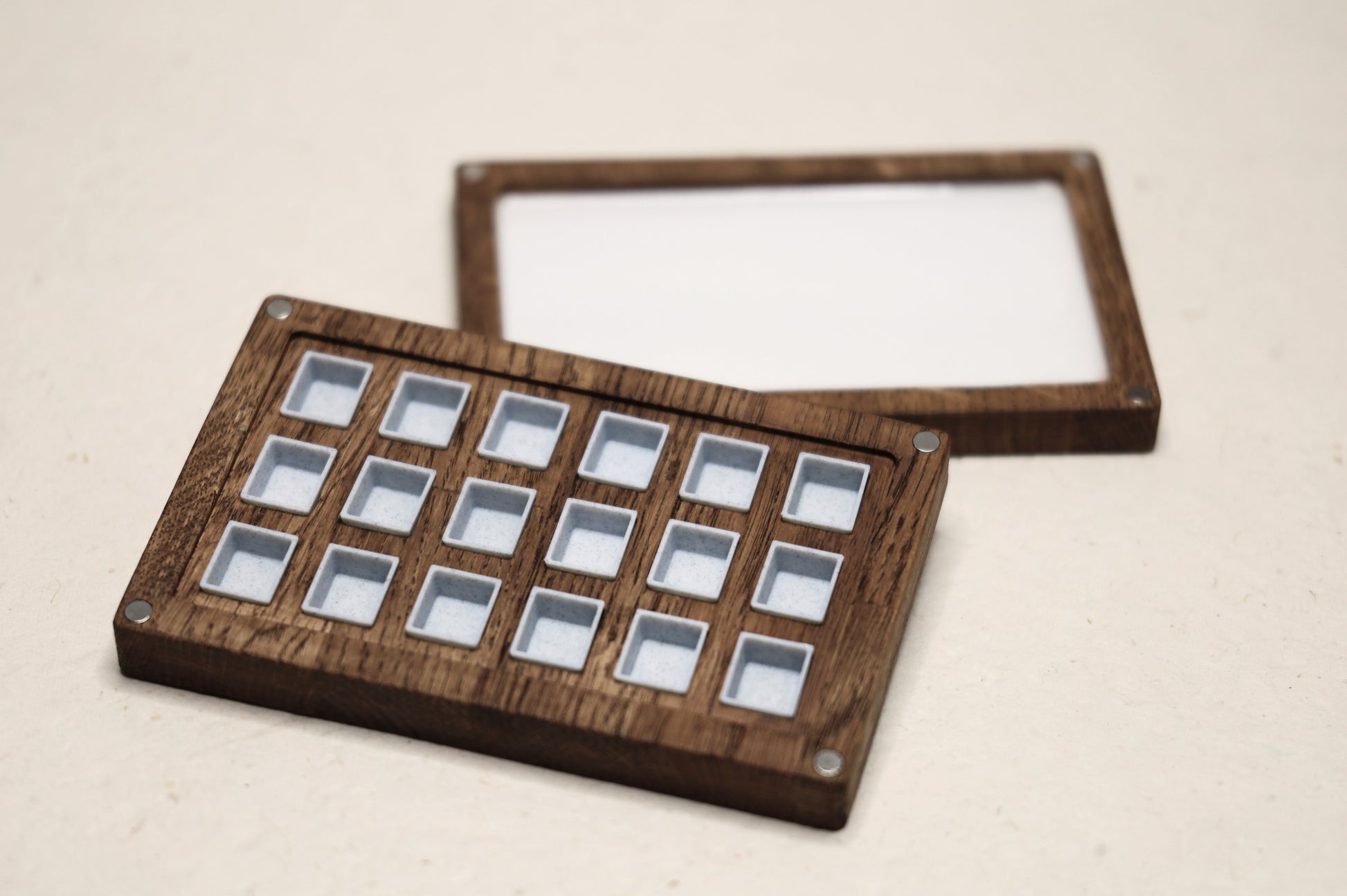 The lid has a mixing tray inside, made of epoxy resin. The box opens and closes with four magnets attached in every corner and can hold up to 18 half pans. It's designed specifically for our 3D-printed half pans and 18 empty half pans are included (you can, of course, buy more of them separately).