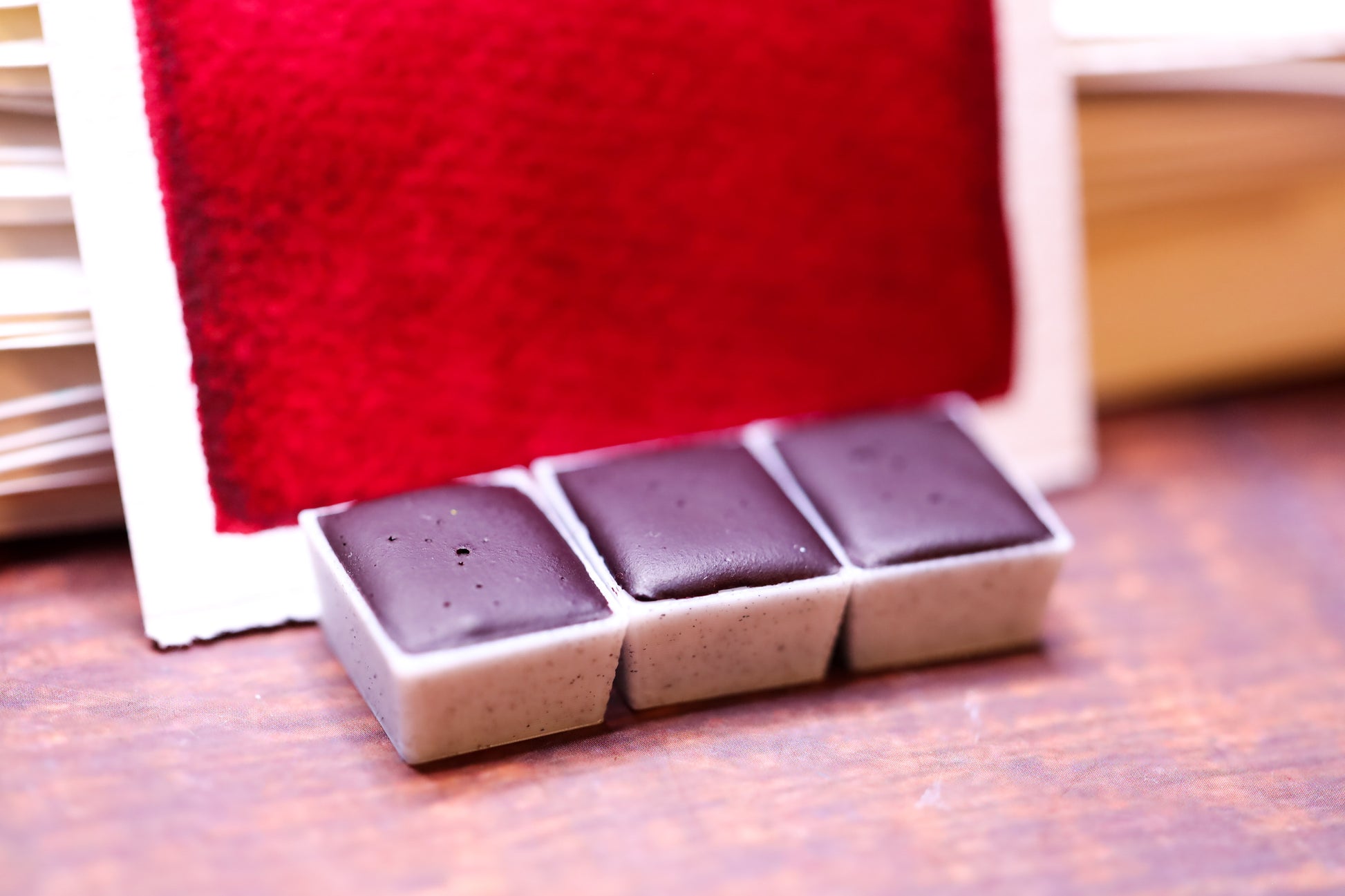 Your order is carefully packed, watercolor pans are are wrapped in a label made of hand-painted Arches paper, with pigment properties detailed on the sides. The label includes an anti-stick section to prevent the paint from adhering to it or the packaging.