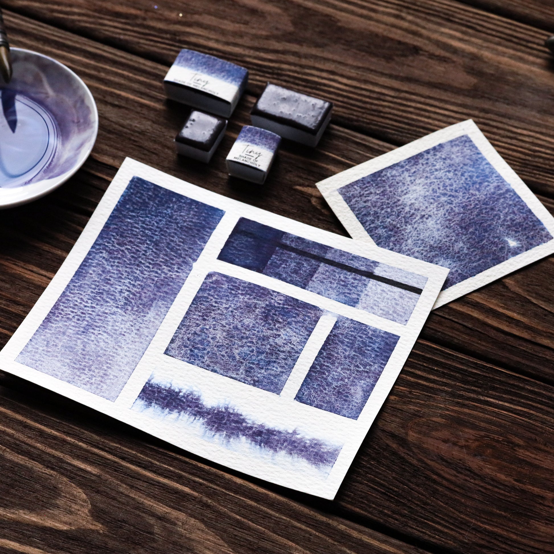 Your order is carefully packed, watercolor pans are are wrapped in a label made of hand-painted Arches paper, with pigment properties detailed on the sides. The label includes an anti-stick section to prevent the paint from adhering to it or the packaging.