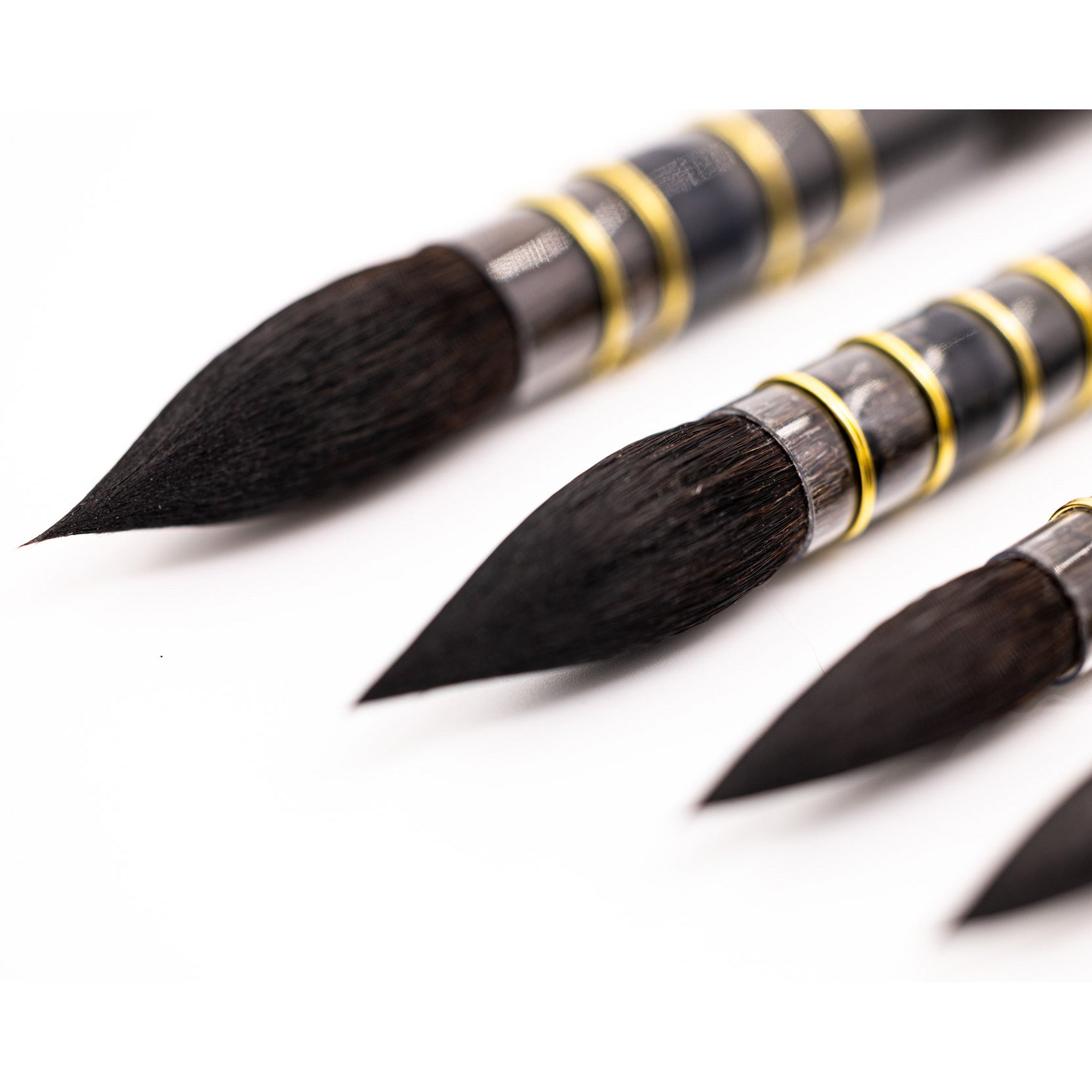 A traditional brush with a redefined modern design. Made for today’s watercolor artists; a thin tip, great color retention, and just the right spring.
