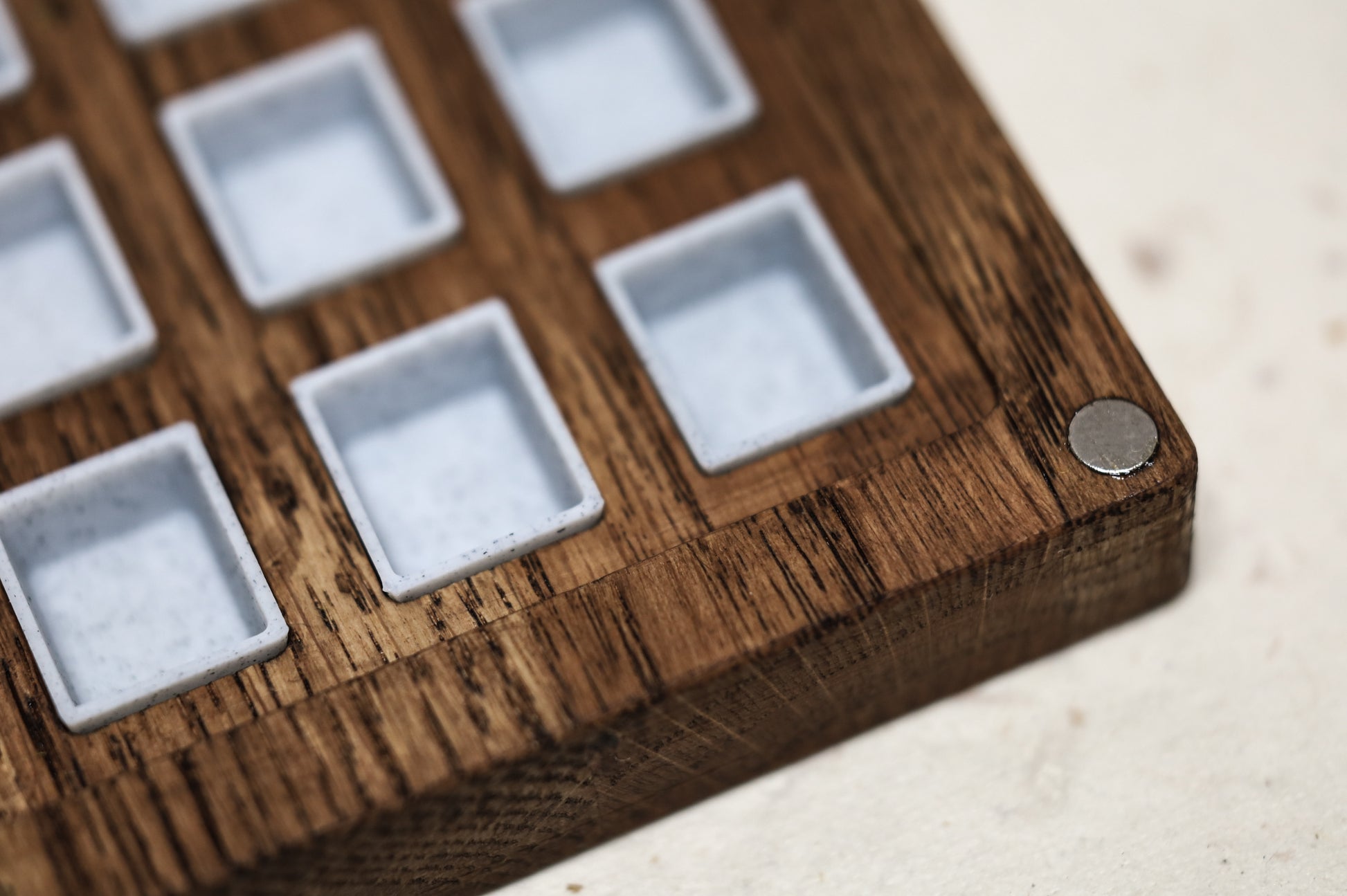 The deluxe edition holds up to 36 half pans divided over two compartments. Both compartments and the lid can be (de)attached with four magnets in every corner. The lid has a mixing tray inside, made of epoxy resin. It's designed specifically for our 3D-printed half pans and 36 empty half pans are included (you can, of course, buy more of them separately).